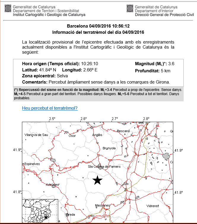 Readacción – El terremoto se ha notado considerablemente porque se ha originado a solo 500 metros de profundidad. Un terremoto de magnitud 3,6, según asegura fuentes del Instituto Cartográfico de la comunidad autónoma española de Cataluña en un comunicado, se ha notado en las comarcas de La Selva, el Gironés y el Maresme. Barcelona (España), domingo 4 de septiembre de 2016. Fotografía: Datos facilitado por el Instituto Cartográfico de Cataluña. Lasvocesdelpueblo.
