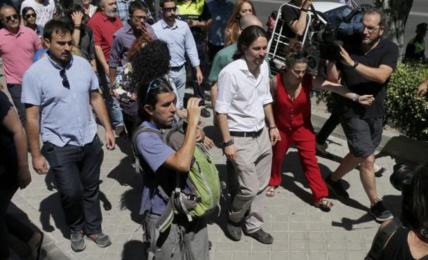 Efe – Unidos Podemos mantiene la calma y la prudencia ante las encuestas a pie de urna que apuntan que quedaría en segunda posición en las elecciones por delante del PSOE, aunque las sensaciones son buenas. De esta forma reaccionaban fuentes de Unidos Podemos tras conocer la encuesta a pie de urna elaborada por Sigma Dos para TVE y la Forta, según la cual el PP ganaría las elecciones con un 28,48 por ciento de los votos y entre 117 y 121 escaños, seguido de Unidos Podemos, con el 25,61 por ciento y entre 91 y 95 diputados, mientras que el PSOE se quedaría con un 21,98 por ciento y entre 81 y 85 escaños. Madrid (España), domingo 26 de junio de 2016. Fotografía: El candidato de Unidos Podemos a la presidencia del Gobierno, Pablo Iglesias, a su llegada al Instituto Tirso de Molina de Madrid, donde depositó su voto. Efe.