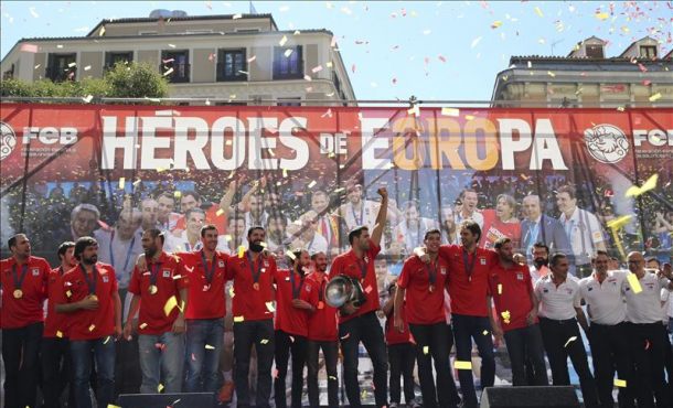 Sergio Rodríguez le pidió a la afición que cantara con él un «campeones de Europa», mientras que Llull recordaba que esta selección «se crece en los momentos difíciles», y pedía un reconocimiento para el cuerpo técnico del equipo. El ala-pívot de origen montenegrino Nicola Mirotic calificó la experiencia como «inolvidable». «Gracias por hacerme sentir un español más», dijo el jugador de los Chicago Bulls, a lo que la gente respondió con un «Yo soy español, español, español».