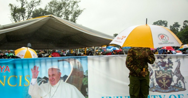 En el segundo día de visita del pontífice a África, unas 200.000 personas, según la prensa local, desafiaron la lluvia y se congregaron en el campus de la universidad de Nairobi, adonde Francisco llegó en papamóvil.
