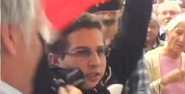 Lasvocesdelpueblo y Agencias – Se ha expulsado un chaval joven con bandera de España este mediodía en el colegio electoral durante la votación del presiente autonómico de Cataluña y candidato número 4 de la candidatura separatista excluyente catalana Juntos Por El Sí (JxLSí). Tal como se ve en las imágenes facilitadas al diario ‘El Mundo’ por un aficionado presente en la sala. Por otra parte, Artur Mas Gavarró ha celebrado este domingo la «gran victoria de la democracia en Cataluña» a pesar de los «obstáculos» del Estado y en concreto de la «política española». Barcelona, 27 de septiembre 2015. <Fotografía: un joven con una bandera española expulsado del colegio electoral de Artur Mas, hoy en Barcelona>.