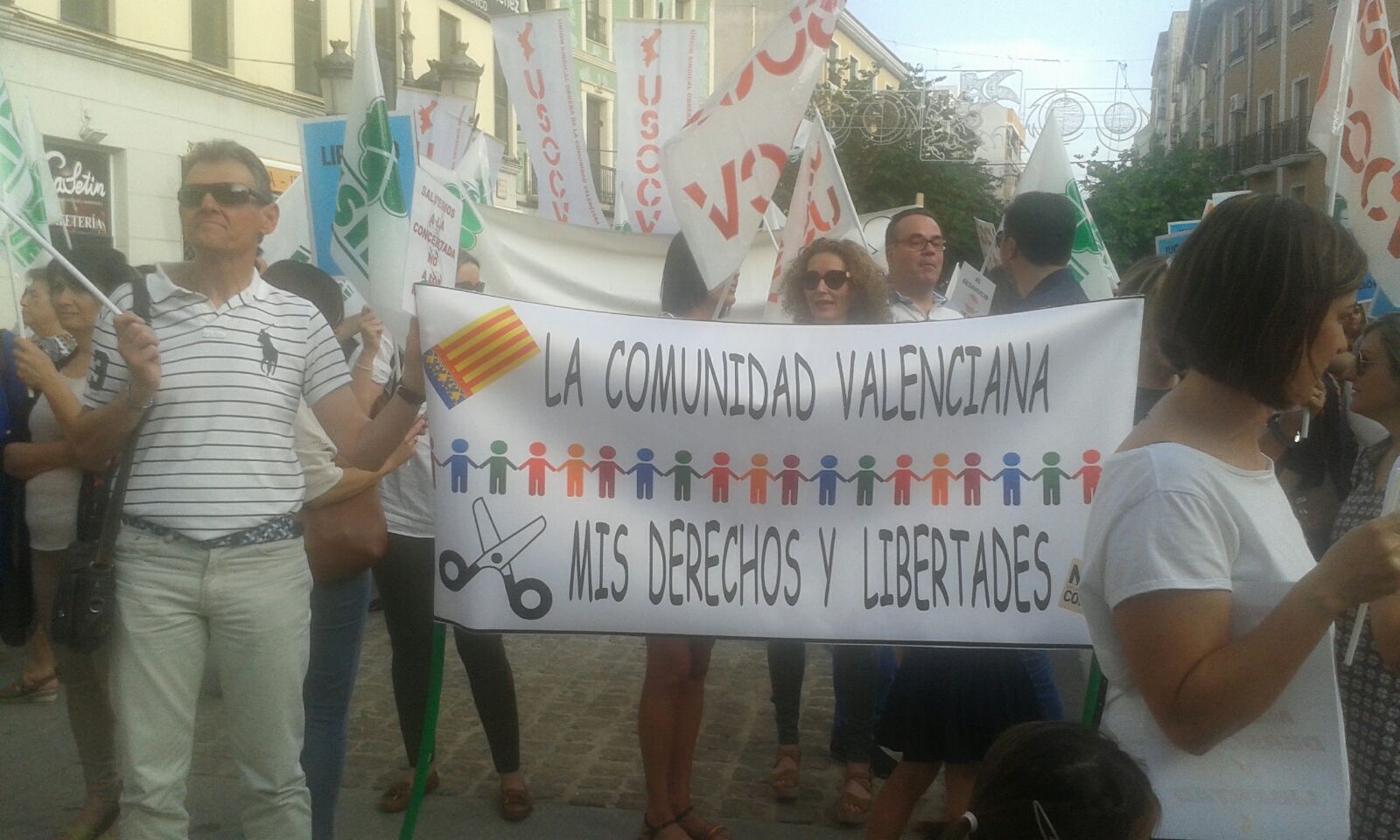 Redacción – La militancia de Alicante de la formación que lidera Santiago Abascal (VOX) participó, la tarde de este jueves 25 de mayo de 2017, en Elda (Alicante) en la concentración «Por la Libertad de Enseñanza» contra la última ley -de gobierno tripartito valenciano de la extrema izquierda radical (Podemos), separatistas valencianos de (Compromiso), que lidera la feminista Mónica Otra, y el PSOE de Ximo Puig- una media», dice VOX Alicante, que afecta directamente a «los alumnos, profesores y padres». Alicante (España), viernes 26 de mayo de 2017. Fotografía: Un grupo de padres y profesores con la pancarta «Comunidad Valenciana, Mis Derechos y Libertades», este jueves 25 de mayo de 2017. Lasvocesdelpueblo.