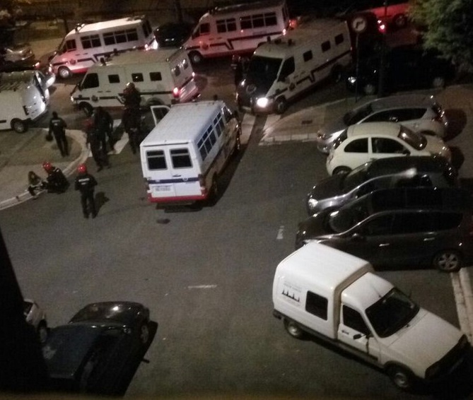 Redacción – Un detenido y varios violento encapuchados identificados, según fuentes policiales. Al finalizar, grupos de encapuchados han cruzado contenedores y han lanzado objetos contra los agentes de la policía autonómica española en País Vasco: La Ertzaintza, que custodiaba el mitin. La Guardia Civil y la Policía Autónoma Vasca, de nuevo, han hecho posible que se celebre el acto, puesto que desde diversas cuentas en redes sociales se motivó para boicotearlo. Vitoria (España), 23 de septiembre de 2016. Fotografía: Furgones de las fuerzas de seguridad esta noche para proteger a los simpatizantes y militantes del VOX durante su acto de cierre de campaña en Vitoria. lasvocesdelpueblo.