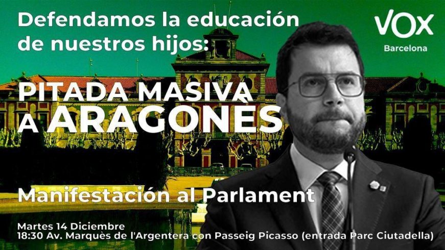 Redacción.- VOX Barcelona ha hecho este sábado un llamado a su 166.056 votantes de las elecciones catalanas del pasado 14 de febrero de 2021 a acudir «con tu bandera» y «con lo que tengas para hacer ruido…» porque «ahora o nunca», ha llegado el momento de decir «¡Basta ya!» al presidente de Gobierno autonómico de la Generalidad de Cataluña, «Pere Aragonès García (ERC)» mediante un ««Jarabe democrático» (escrache pacífico), pero del de verdad». «Esperaremos a Aragonés con toda nuestra ilusión», apuntan desde el partido que preside Santiago Abascal Conde en la provincia de Barcelona.