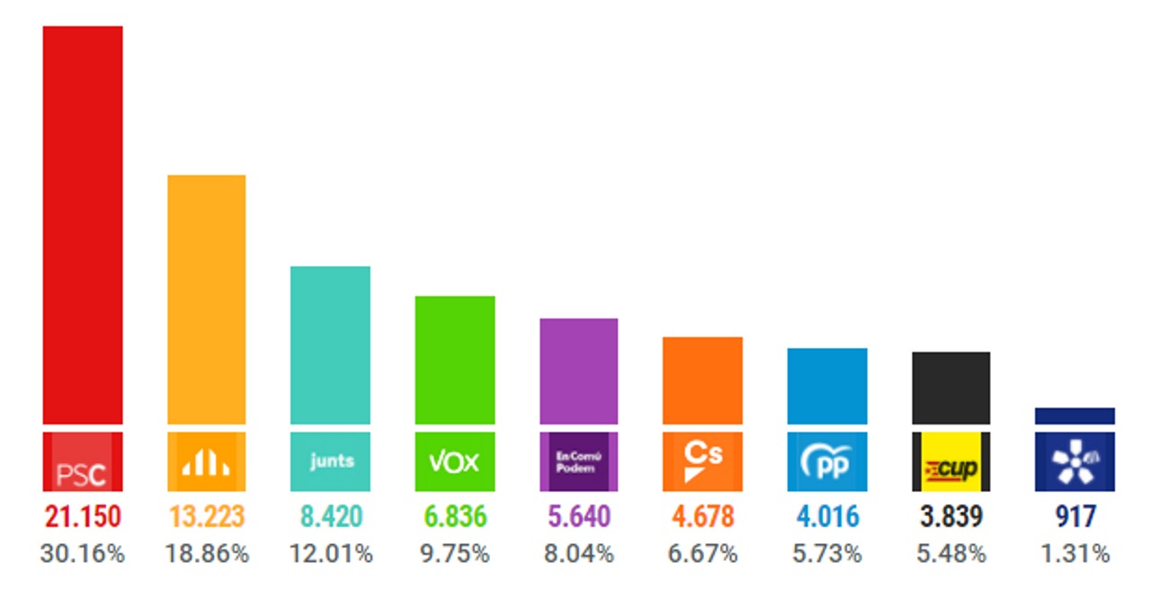 Asimismo, en Badalona donde la extrema izquierda y el separatismo se movilizaron para impedir que VOX diera a conocer su programa electoral a los vecinos de la ciudad, el partido que preside Santiago Abascal Conde, es cuarta fuerza con 6.836 votos (9.75%) detrás de la derecha separatista JxCAT con 8.420 votos (12.01%). El PSC ganó las elecciones en Badalona con 21.150 votos (30.16%) seguido de la ultraizquierda separatista ERC con 13.223 votos (18.86%). Ciutadans Partit de la Ciutadanía-Ciudadanos Cs pasó de primera fuerza a la sexta perdiendo más de 34.000 votos de sus 38.554 votos de 2017, obteniendo solo 4.678 (6,67%) detrás de la ultraizquierda Podemos (Cataluña En Común Podemos) 5.640 (8,04%). El PP es séptima fuerza en su bastión de Badalona con 4.016 votos (5.73%) seguido de cerca por la extrema izquierda separatista beligerante CUP con 3.839 votos (5.48%). Finalmente, la derecha separatista PDECAT es última con 917 votos (1.31%).