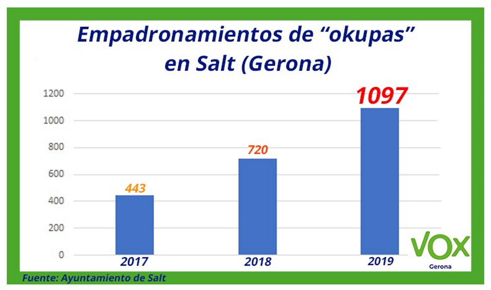 Redacción -El Grupo Municipal de VOX en la localidad gerundense de Salt (Cataluña) saca a la luz que «cada año se empadronan más personas en viviendas ocupadas en el pueblo». Las ocupaciones conflictivas son un problema real en el municipio de Salt, desde hace mucho tiempo. Tanto es así que desde la entrada en el Gobierno separatista de ERC «éstas no han dejado de aumentar», según afirman este domingo, 23 de febrero de 2020, fuentes del grupo municipal de VOX al digital español Lasvocesdelpueblo. Salt (Gerona) España, miércoles 26 de febrero de 2020.