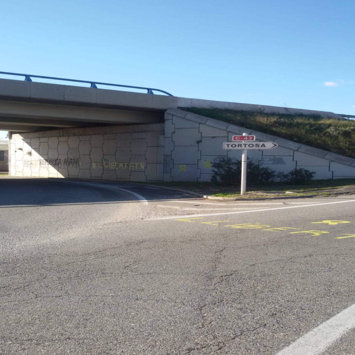 Redacción – Frente al Polígono Industrial de El Bajo Ebro —comarca catalana ubicada en la provincia de Tarragona— tanto en la salida como en la entrada del municipio de Tortosa, a la altura de la pedanía de Campredó —una entidad municipal descentralizada del municipio de Tortosa— lucen pintadas con pintura amarilla y símbolos secesionistas a favor de los presos golpistas del llamado ‘Procés’ —proceso de separación de Cataluña del resto de España, iniciado con fuerza el pasado mes de enero de 2017 con la llegada al poder regional del huido máximo del Procés’, Carles Puigdemont Casamajò—. Tortosa (Tarragona), domingo 1 de enero de 2020.