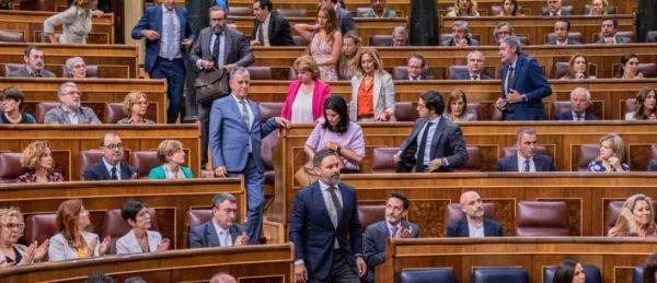 .Los diputados de VOX abandonan el hemiciclo del Congreso de los Diputados en señal de protesta por la presencia del terrorista presidente de Colombia