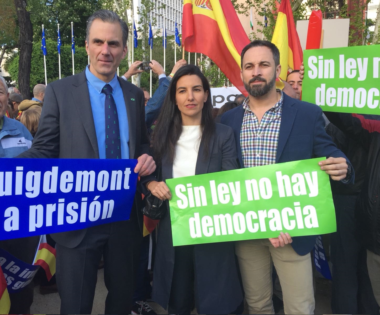 Redacción – VOX ha participado esta tarde en la concentración convocada por la Fundación para la Defensa de la Nación Española (DENAES) frente a la sede de la Unión Europea en Madrid por la defensa de la dignidad y la soberanía de España y para exigir a Alemania la extradición de Puigdemont. Madrid (España), jueves 3 de mayo de 2018. Fotografía: MADRID (ESPAÑA), 03.05.2018. En la imagen los miembros de la ejecutiva de VOX, el secretario general de VOX y responsable de la dirección letrada de la acusación popular de VOX contra los golpistas en la causa del Tribunal Supremo, Javier Ortega Smith (izquierda), la presidenta de VOX en la comunidad de Madrid, Rocio Monasterio (centro), y el presidente de VOX, Santiago Abascal Conde (derecha), durante el acto de los ‘voxes’ donde la formación verde española ha exigido a Alemania extraditar al huido expresidente catalán Carles Puigdemont a España,. Lasvocesdelpueblo