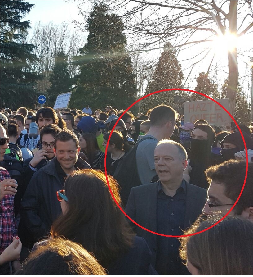 Redacción – Los servicios jurídicos de VOX han presentado la mañana de este viernes, 21 de abril de 2017, una querella criminal ante los Juzgados de Instrucción de Madrid contra el Decano de la Facultad de Derecho de la UCM, Ricardo Alonso García, el Vicedecano de Relaciones Institucionales e Internacionales, José María Coello, y contra el Vicedecano de Alumnos Rubén Carnerero por «boicotear una conferencia prevista para el pasado 10 de marzo de 2017 —y que finalmente no se permitió celebrar— en la Facultad de Derecho de la UCM donde iban a participar Rocio Monasterio, presidenta de VOX Madrid, y Alicia Rubio, Vicesecretaria de Movilización de VOX y autora del libro «Cuando Nos Prohibieron Ser Mujeres… Y Os Persiguieron Por Ser Hombres»». Madrid (España), sábado 22 de abril de 2017. Fotografía: (Lasvocesdelpueblo)–. En las imágenes, se ve a los ultraviolentos feministas atacando brutamente e increpando físicamente a puñetazos a voces discrepantes, mientras los pacíficos simpatizantes del colectivo Provida español Hazteoír y del partido español (VOX), manos arriba, se defienden con solo la palabra y a gritos de: «¡liberta, libertad, libertad!» y «¡libertad de Expresión, libertad de expresión!». Madrid (España), sábado 11 de marzo de 2017. Madrid, 11.03.2017. El Decano de la Facultad de Derecho de la UCM, Ricardo Alonso García, junto a encapuchados extremistas contra la conferencia sobre la libertad de Expresión. Lasvocesdelpueblo.