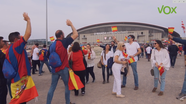 Vídeo. MADRID (ESPAÑA), 21.04.2018. VOX reparte 20 mil banderas en la Final Copa del Rey entre Sevilla y FC Barcelona
