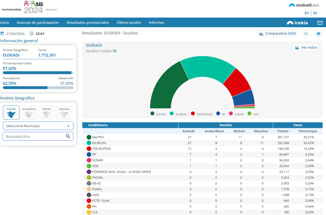 Con el 97.42 % del escrutinio, un total de 20.994 compatriotas vascongados han depositado todas sus esperanzas en VOX del opositor español natural de Álava, Santiago Abascal Conde, quien decidió quedarse en Vitoria esta noche electoral para ser uno de los miles y miles de testigos de este otro día histórico de la familia verde del Reino de España.