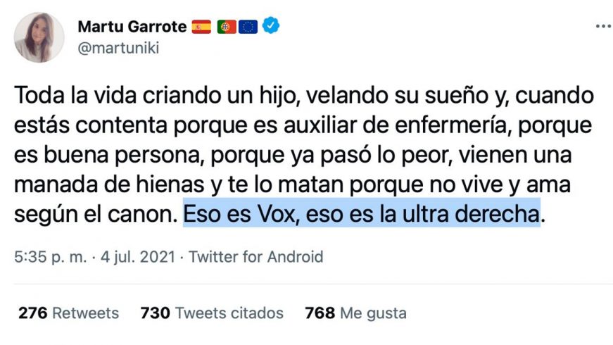 La tuitera socialista escribió en una de sus entradas: «Toda la vida criando un hijo, velando su sueño y, cuando estás contenta porque es auxiliar de enfermería, porque es buena persona, porque ya pasó lo peor, vienen una manada de hienas y te lo matan porque no vive y ama según el canon. Esto es VOX, eso es la ultra derecha».