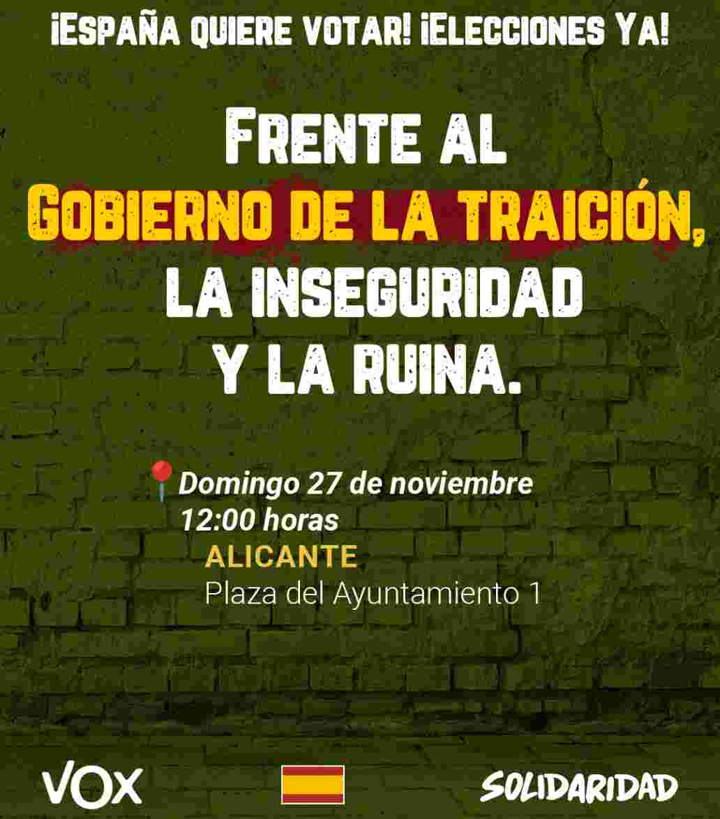Redacción.- Alicante (España), domingo 27 de noviembre de 2022. Bajo lema «¡España quiere votar! ¡Elecciones ya!», el partido político VOX, que preside Santiago Abascal Conde, y el Sindicato para la Defensa de los Trabajadores de España Solidaridad, que lidera el vecino de Andalucía Rodrigo Alonso Fernández, claman hoy contra la «traición a España» perpetrada por el presidente de Gobierno de coalición socialcomunista de España y secretario general del PSOE, Pedro Sánchez Pérez Castejón, en todas las capitales de provincias del reino, con un acto centro en Plaza Colón de la capital del reino, Madrid.
