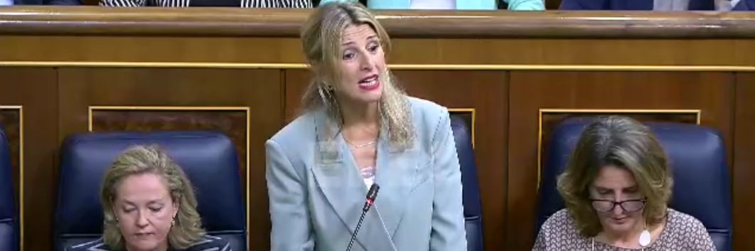 La ministra comunista: «[…] saben lo que hicieron ustedes, votaron en contra. Y, en la actualidad, señoría, cuando vivimos la guerra de su aliado: Putin, en Ucrania, prohibimos despedir […]», ha dicho textualmente la vicepresidente segunda y ministra de Trabajo y Economía Social y dirigente del Partido Comunista de España, faltando claramente a la verdad.